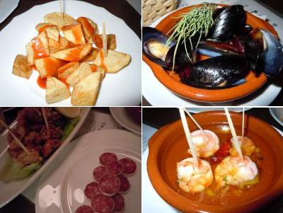 ポテトブラバス・ムール貝の白ワイン蒸し・イベリコ豚のチョリソー・フライドチキンのチリガーリック、小海老のアヒージョ