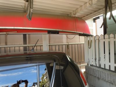 鉄柱を撤去するたびガンガンやってたから、物凄い音だとは思ってたけど、夕方何気に家の駐車場を見たら、だ~が以前バクと釣りに行く時に乗ってたカヌーが落ちかけてた・・・(>_<)
