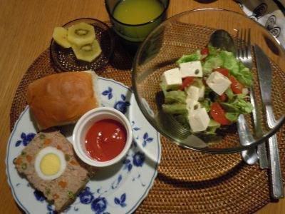 ミートローフ、サラダ、パンプキンスープ、パン、それにゴールデンキウイまであるよ~\(◎o◎)/!