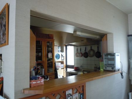 で~業者さん(近所のパパさん)にキッチンの入り口にオリジナルのドアをつけてもらい、更にカウンターには網を張り巡らせ、たいし侵入防止策をしてたんだけど、たいしもすっかりイタズラをしなくなったってことで、2年前にはカウンターの網を撤去し、ドアも昨年末に作った壁の方に付け替えたんだよね