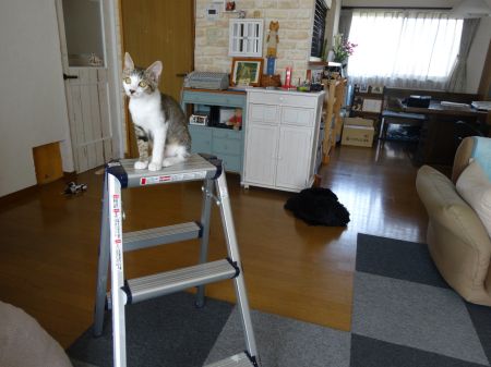 脚立がお気に入りになっちゃって、片づけようとしてもなかなかどいてくれなかったよ~~~(~ヘ~;)