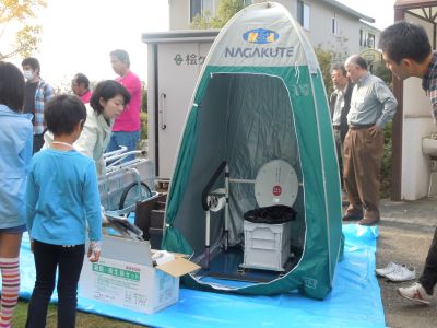 防災倉庫の中には組み立て式のトイレやリヤカー、斧や大鍋が常備されてたよ
