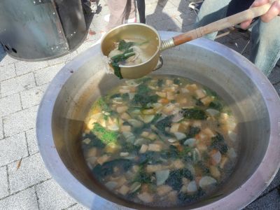 ゲームが終わったらお昼ってコトで、炊き出し訓練の名のもとに、防災倉庫に入ってる物と同じ大鍋で(今回は貸出の鍋を使用)すいとんを作って参加者に振る舞う