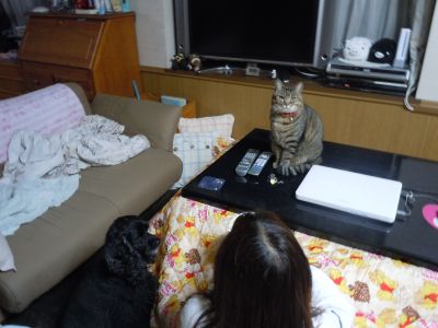 昨日もちょうどわんにゃんのご飯の時間に友だちが来たんだけど、ご飯を食べずに2階に避難したたいしの分を、一生懸命伸びあがって食べてたゆきち・・・(;^_^A