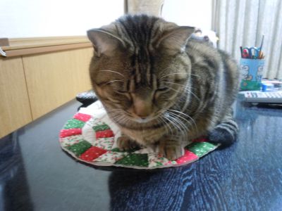 ってか、作ってる途中でも、針に糸を通すため布を離すと、一瞬の隙をついてこうやって布の上に乗ってくつろいでくれちゃうから、なかなか完成しなかったの・・・(*_*;